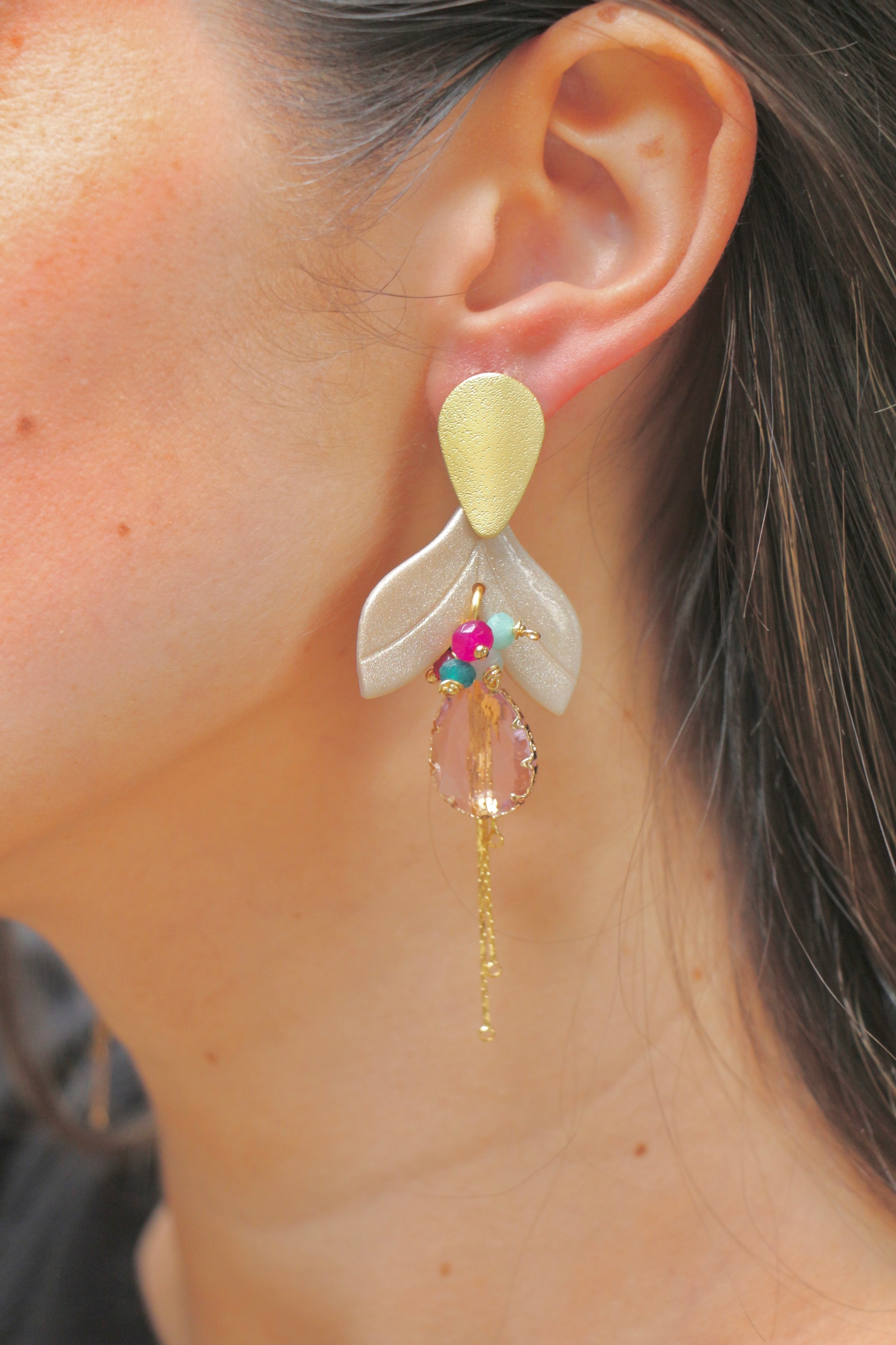 aros en arcilla Polimerica, dijes enchapados, piedras naturales, cristales y resina.